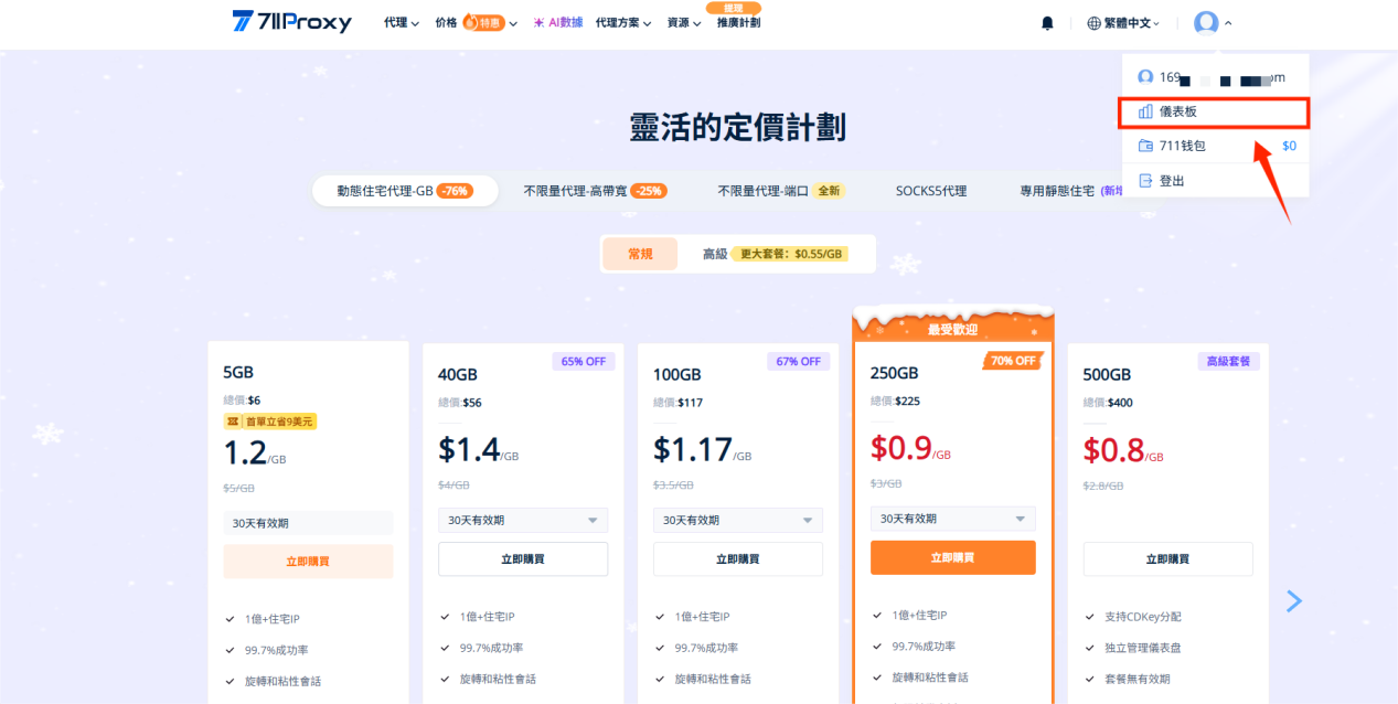 3.购买完成后点击【仪表盘】,进入代理配置页面