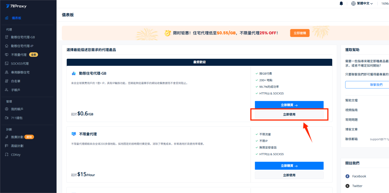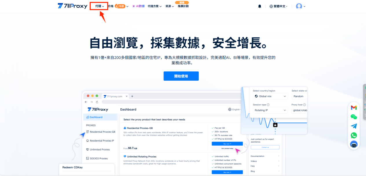 2.登录后在官网页面,点击【代理】,选择您需要的代理服务类型