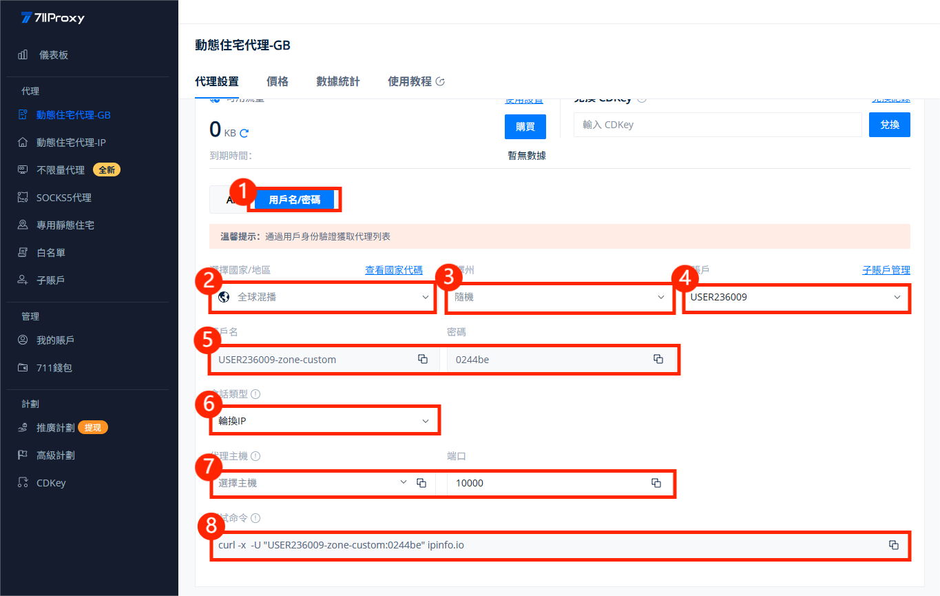 这里以账密认证为例,依次选择您的目标国家/地区(或随机位置)、需要访问代理的子账户、会话类型、代理主机与端口。