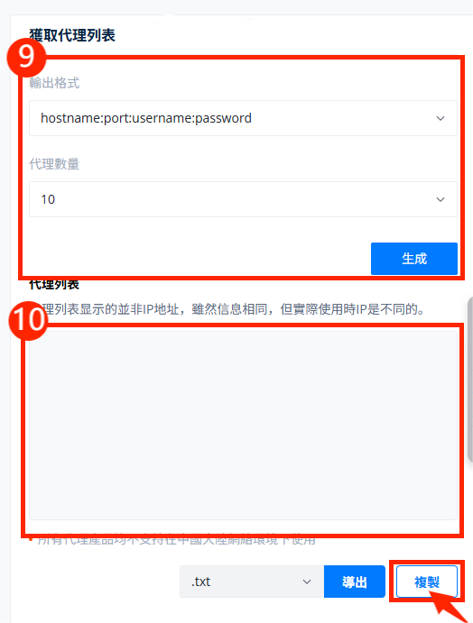 在右侧“获取代理列表”部分,你可以设置需要的代理数量,并单击“生成”按钮。